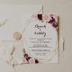 Den här burgundy blommigten brunch & bubly inbjudningskort för möhippan är perfekt för en modern möhippa. Utformningen har grönt i elegant, , lila, rött och burgundärt, handritat blomklot, adorering av guld geometriskt ramar, inspirerande klass och skönhet.