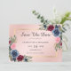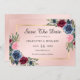 Vackra vattenfärgblommor och grönaktig inramning av detaljerna kring bröllop i guld ram över en rosa-övertoningsbakgrund för detta marinblått, burgunnigt och blommigt-kort för elegant som lätt kan vara bröllop spara datum för personlig. Matchande artiklar som är tillgängliga för att komplettera dessa kort för rustik blommigt bröllop spara datum.