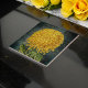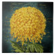 Vintagens kollage på denna dekorativa keramiska platta har ett vackert gyllene gult spinder chrysanthemum mot en stressad tealdammbakgrund, liknande den i tapet. Golden-handskriften tillför ett unikt intresse till den blå gröntens texturerade bakgrund. Den blomma som visas på den här plattan kommer från en gammal, offentlig, botanisk illustration.