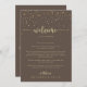 Guld konetti brun bröllop välkomnar brev som är perfekt för ett rustiskt bröllop. Den enkla utformningen och utformningen av eleganten har skripttypografin klassisk och finare i guld. Anpassa fronten med ett välkomstmeddelande till dina gäster och till namn. Anpassa baksidan med schemat för händelser och annan användbar information.