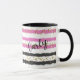 Hand som målas upp i rosa och svart rand är kännetecknet för detta unika och attraktiva mugg. Rand placeras på en vit bakgrund med en smattering av guld-cirkelkonfetti. Hennes namn är skrivet i svart skrift på två sidor av mugg.