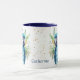 Personlig mugg har en vacker vattenfärgsbild av en blå papegoja som genomkorsas av tropiska löv för grönt och orange. Bilden skrivs ut två gånger på mugg, med ditt namn eller annan text mellan dem. Allt placeras på en guld och blå konfektyr.
