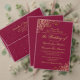 De här OSA vykorten gör det enkelt för dina gäster att svara på din bröllopsinbjudan. De har en sofistikerad klassutformning med guld-text på en maronröd eller burgundröd bakgrund. Kortets hörn dekoreras med en lacy blommigt filigree. På baksidan finns en ställe som anger antalet gäster som är närvarande och val av måltid. Snyggt hölje för dina bröllopsinbjudningar.