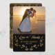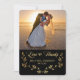 Fotografiet tar en mittpunkt överst i det här lodrät. Tack för ditt kort, bröllop. Texten "Tack" är skriven i ett söt skript i guld nedanför fotot, med texten i anpassningsbarna. Texten placeras på en dramatisk svart bakgrund och ramas in med en söt guld löv-halvandebild. Baksidan av inbjudan är ett guld-dammmönster i vintage på svart. En aning gammaldags kvalitet med ett modernt utseende!