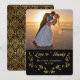 Fotografiet tar en mittpunkt överst i det här lodrät. Tack för ditt kort, bröllop. Texten "Tack" är skriven i ett söt skript i guld nedanför fotot, med texten i anpassningsbarna. Texten placeras på en dramatisk svart bakgrund och ramas in med en söt guld löv-halvandebild. Baksidan av inbjudan är ett guld-dammmönster i vintage på svart. En aning gammaldags kvalitet med ett modernt utseende!