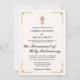 Den eleganta vita bröllopsinbjudan "The Gold Elegant Border Nuptial Mass White Invitation" utstrålar en klassisk och sofistikerad charm, perfekt för par som planerar ett högtidligt och elegant bröllop. Inbjudningskortet har en elfenbensvit bakgrund som ger en varm och subtil duk, som förstärker den övergripande känslan av delikat och förfinad estetik. Denna mjuka bakgrund kontrasterar vackert mot det mest iögonfallande draget: en elegant och invecklad guldbordlinje som omger kortet och ger en lyxig och tidlös känsla.