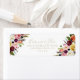 Denna returadressetikett för den tropiska blommigten i guld är perfekt för ett modernt bröllop. Utformningen har handmålade bruna fjädrar, boho-gult, vit, lila, rosa, , burgundblommor och blåbär som är snyggt placerade i vackra buketter.