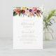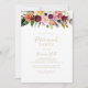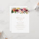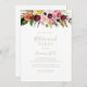 Denna inbjudan till det tropiska pension-partiet i guld är perfekt för en modern händelse. Utformningen har handmålade bruna fjädrar, boho-gult, vit, lila, rosa, , burgundblommor och blåbär som är snyggt placerade i vackra buketter.