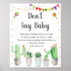 Det här beundransvärda Säg inte att Baby Game är en roligt, interaktiv metod för att sparka av roligten på din babyskor och garanterat att vara en stor slå! Bara visning det här söta tecknet nära ingången till babyduschen tillsammans med en basket av kläder. Varje gäst bäror ett tygespin. När de hör en annan gäst säga "Baby", kan de ta med sig sin klädsel. Den som har mest i slutet av duschen vinner! Konstruktionen har vattenfärgsuckulenter med färgstarka fiesta flaggor och guld-folie-konfetti.