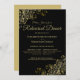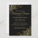 Denna vackra inbjudan till bröllop Rehearsal Dinner har en enkel elegant av guld-text på en svart bakgrund med guld-kyl och blommigt i hörnen. Innehåller information om själva repetitionen och om den förnyade middagen i firande. Elegant, klass, sofistikerad och chic.