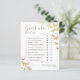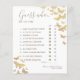 Guldfjärilar, handritade i akvarell och digitalt skiktade med guld och gnistrande effekter (detta är INTE riktig folie!) pryder detta enkla och eleganta, boho-chica anpassade bröllopsfest "Gissa vem..." spelkort som har modernt kalligrafi-skriftsnitt. Anpassa det helt med brudens namn och datum samt var och en av de tio frågorna.