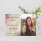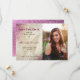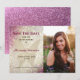 Meddela din stora dag med elegans och glans med detta Quinceañera-sparadatumkort. Den vänstra sidan visar en skimrande gyllene fjäril mot en rosafärgad och glittereffektbakgrund med modern kalligrafi i burgunderrött och svart. Den högra sidan innehåller ett personligt foto av födelsedagsflickan, vilket ger en hjärtlig och stilfull touch. Helt anpassningsbart med ditt namn, datum och detaljer, är denna design perfekt för en glamourös och minnesvärd Sweet 15-fest.