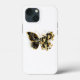 Guld blomfjäril med svart smyckesmunkid, dekorerad med guld löv på vit bakgrund.