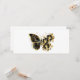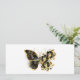 Guld blomfjäril med svart smyckesmunkid, dekorerad med guld löv på vit bakgrund.