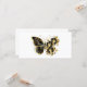 Guld blomfjäril med svart smyckesmunkid, dekorerad med guld löv på vit bakgrund.