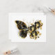 Guld blomfjäril med svart smyckesmunkid, dekorerad med guld löv på vit bakgrund.