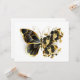 Guld blomfjäril med svart smyckesmunkid, dekorerad med guld löv på vit bakgrund.