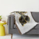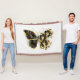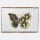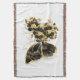 Guld blomfjäril med svart smyckesmunkid, dekorerad med guld löv på vit bakgrund.