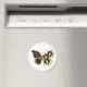 Guld blomfjäril med svart smyckesmunkid, dekorerad med guld löv på vit bakgrund.