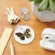 Guld blomfjäril med svart smyckesmunkid, dekorerad med guld löv på vit bakgrund.