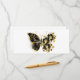 Guld blomfjäril med svart smyckesmunkid, dekorerad med guld löv på vit bakgrund.