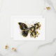 Guld blomfjäril med svart smyckesmunkid, dekorerad med guld löv på vit bakgrund.