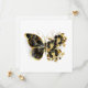 Guld blomfjäril med svart smyckesmunkid, dekorerad med guld löv på vit bakgrund.