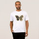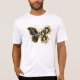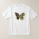 Guld blomfjäril med svart smyckesmunkid, dekorerad med guld löv på vit bakgrund.