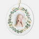 Elegant, modernt och söt baby fotojulprydnad. Denna blankett innehåller en blommigt med guld och grönt och röda bär. Återvänd för att visa en förträfflig illustration av Grönt baby dinosaur som sover under guld gultens stjärnor med anpassningsbar Baby namn. Underbar för både pojke och flicka. Perfekt för alla säsonger!