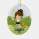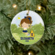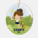 Personifiera daterade gulliga blått & gulna den guld- uppsättningen för prydnaden för jul för flickan för brunetthejaklacksledaren glädjande på ett gräs med trädbakgrund. Hurra prydnadsärdrag poms för en pom för gullig hejaklacksledare hållande med en megafon. En undra julgåva sure som ska uppskattas för många år till komen.
