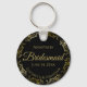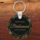 De här nyckelkedjorna är designade för ge som favoriter för brudar i bröllopsfesten. De har en enkel men ändå elegant utformning med en klassisk svart bakgrund, skript i guld och en lacy golden faux foil blommigt gräns. I texten står det "Bridesmaid" med plats för hennes namn, parets namn och datumet i bröllop. Perfekt för att tacka dina brudar för att de är en del av din speciella dag!