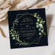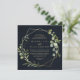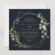 Den här guld-geometriska blåa grönten diamantbröllopsinbjudan är perfekt för ett modernt bröllop. Utformningen har handmålad vacker grönt som lämnar i mörk blått bakgrund och lägger till ett guld geometriskt ram.