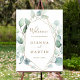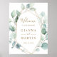 Detta bröllop välkomsttecken är färgat med vattenfärgen eukalyptus och botaniska grönt löv med guld geometriskt ram. Om du vill ha en mer avancerad anpassning av den här designen klickar du på Anpassa ytterligare för att ändra teckensnitt, storleka och färg.