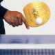 En faux guld tittar bakgrund med faux guld glitter droppar, färgdroppstift. Anpassa och lägg till ditt första namn, monogram initialer och fullt namn.
