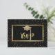 Guld glitter examensmössa och konfetti på svart bakgrund.