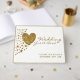 Den här gästen bok är perfekt för vilken glatt temad bröllop. Utformningen har ett glitter-hjärta i guld och glitter-stjärnor i guld, perfekt för alla moderna firande i bröllop.