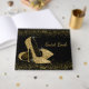 Höghalsskokgäst bok i guld med högklackskor från guld glitter på elegant svart och guld glitter. Du kan enkelt anpassa den här vackra dam födelsedagsfest-gästen i svart och guld på hög höjd för evenemanget genom att helt enkelt lägga till texten i stil som du väljer. Du kan också ändra bakgrunden till färg. Det här är en tryckt design utan äkta glitter.