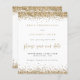Guld Glitter Gräns Bröllop spara datum. Ett budgetmässigt prist mindre än 4,5 x 5,6 tum alternativ. Finns i ett SEMI GLOSS 110 lb-kort LAGRAR, vilket är standardalternativet (rekommenderas för inbjudningar), ELLER SATIN AVSLUTAR 80 lb PAPPER LAGRAR (perfekt för bilagor). Kuvert är ett extra som tillval och är något större än det storleka kortet. Guld faux glitter överst och grund kant och ett informellt skript för Spara Vårt datum. Anpassa enkelt resten av texten till dina detaljer.