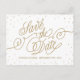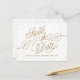 Små, glittrande guld-stjärnor gnistra i konfektmoln runt kant i detta vackra guld och vita Spara vykortet Datum, med ett guld-effektskript för glitter som lyder "Spara datum". Finare, chic och förtjusning på gång. Originalteckningar av Colleen Michele. Observera att det inte finns någon verklig effekt på stjärnorna och manuset i guld eller guld, och att inget glitter, guld löv eller metalliskt bläck kommer att användas i denna inbjudan.