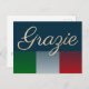 Denna anpassade vykort har ett elegant italienskt tema. "Grazie" är tryckt överst i en vacker gyllene skrivstil. Grazie betyder "Tack" på italienska. Bakgrunden är en rik marinblå färg med en bild av en bleknad italiensk flagga i den nedre delen. Ett exempel på meddelande är tryckt på baksidan, följt av ett familjenamn. Du kan anpassa vykortet för att inkludera ditt eget anpassade meddelande eller annan text.