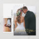 Elegant och enkel bröllop tack-kort mall med handgjord typsnitts text med ett hjärta mellan orden i falskt guldtryck. Lägg till ditt favoritfoto i full bleed på framsidan och ett annat foto på baksidan med standardmeddelande på baksidan som är redigerbart.