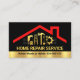 Den svarta täcken har en röd taktopp med en guld stripe lagrar nära basen. Bara under taket finns ett motiv för verktyg i guld handyman följt av namn HOME REPAIR SERVICE i guld. Kontaktuppgifterna finns i biet som är stripe i guld. På andra sidan, i ett svart omslag, är överst en logotyp för handyman verktyg i guld som du kan använda. När detta är dags för er prestigefyllda namn, kontaktinformationen och ett sloganalternativ för att publicera era tjänster. Ett kort för teman för byggnad och handyman. #byggentreprenör #remodeling #byggentreprenör #målar#målare #homerepair #byggnad #homeBuilder #homeconstruction #handyman #roofing #zazzlemade