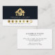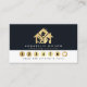 Moderna funktioner för företagsförmånskort städning utrustning inuti guld husikon, namn och rubrik på framsidan på mörkens bakgrund. Perfekt för domestic och städning inom industrin.
