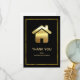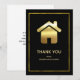 Ett stort tack. Du kort med en enkel bild av ett övertoningshus i guld på en svart bakgrund.