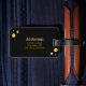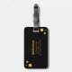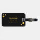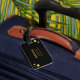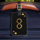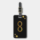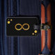 Resväskemärke med guld-infinitysymbol och gyllene prickar konfetti på svart bakgrund.
