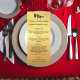 Julmiddagsmeny kort. Anpassa och lägg till namn/händelse, datum och menyn. En falsk guldliknande bakgrund, svart text.