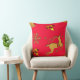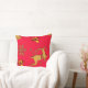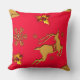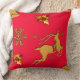 En julkudde med en gyllene renare, guld holly med röda rubies för bär, guldsnöflingor och stjärnor mot en festlig, traditionell julröd bakgrund.