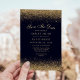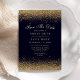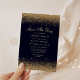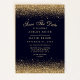 Guld Konfetti Marinblå Modern Spara datum-kort. Vacker enkel vintage glam guld konfetti mot en marinblå bakgrund. Denna anpassade moderna design kan enkelt anpassas med dina egna detaljer.