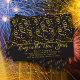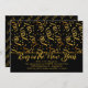 Svart och guld nyårsfest inbjudan mall. Konfetti och serpentiner i guld färg faller överst på denna horisontella inbjudan. ”Ring in the New Year” är den stora texten i modern, virvlade typsnitt. All festinformation är tryckt på fyra rader under den stora texten. Det nya årets siffror bildar ett mönster på baksidan av kortet, glöm inte att ändra det! Visas med uppgraderade rundade hörn, som lätt kan ändras. Uppgradera papperssorten som föredras.