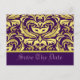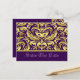 Elegant Guld & Lila Damaskrulle Spara Datum Postkort är ett fantastiskt sätt att tillkännage din brölloppsdag.